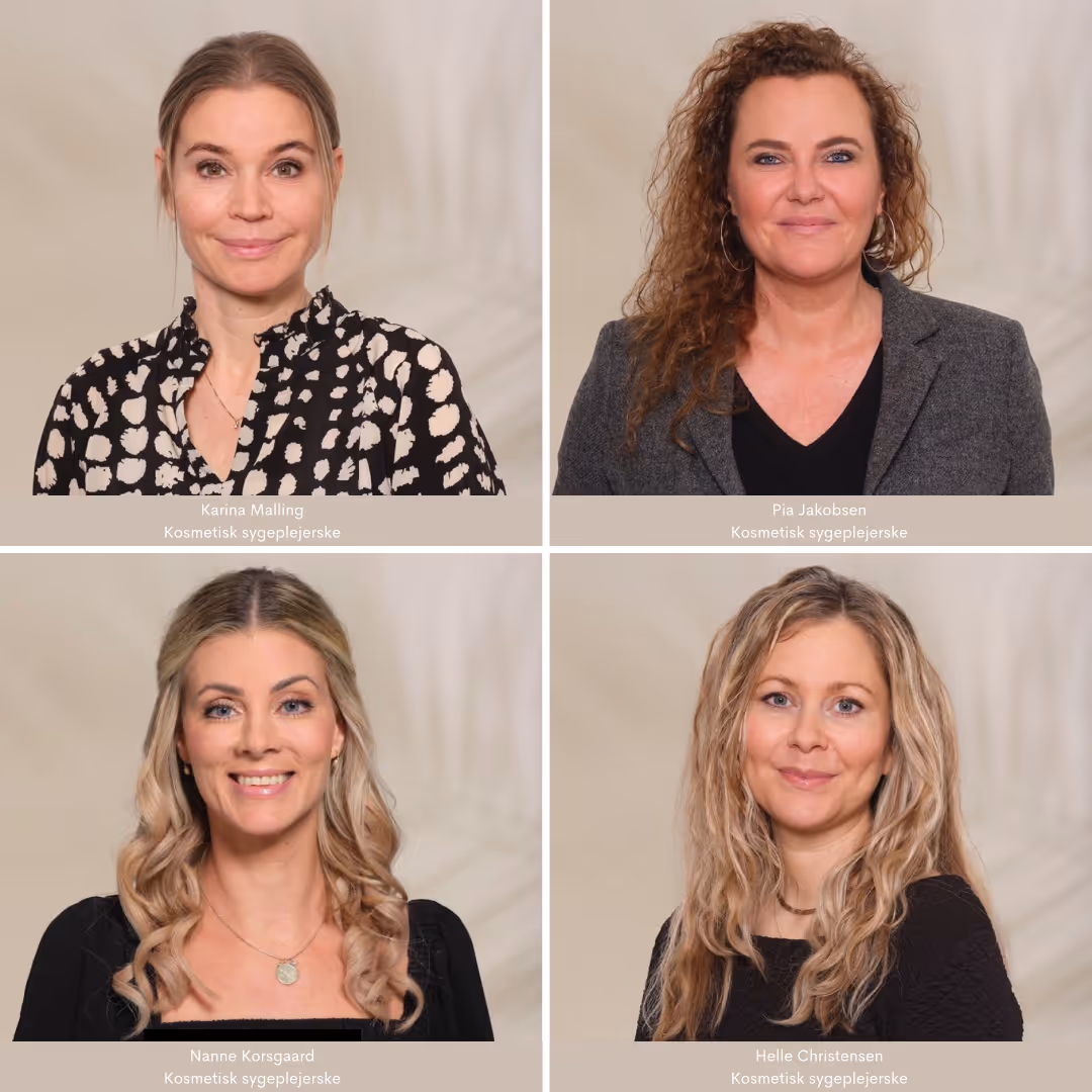 Forundersøgelsen er gratis og uforpligtende og foregår hos én af vores kosmetiske sygeplejersker Karina, Pia, Helle eller Nanne. Ring til receptionen på 23 34 11 72 hvis du har spørgsmål.